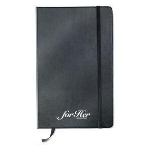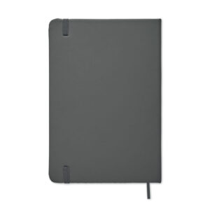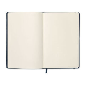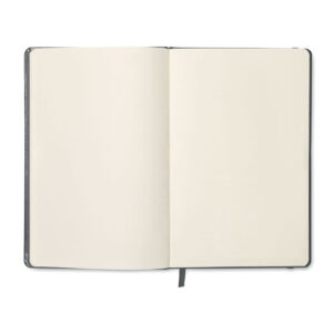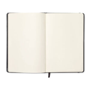 Beležka A5 s trdimi PU platnicami., 192 navadnih strani (96 listov). Elastičen trak za zapiranje in trak za označevanje strani.