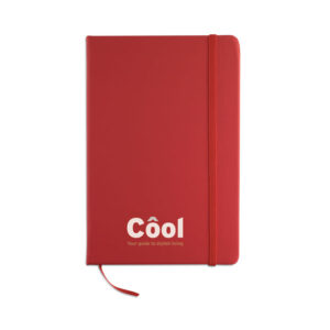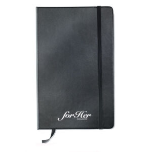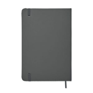 A5 zvezek s trdimi PU platnicami. Vezan na ohišje. 192 črtastih strani (96 listov). Elastičen trak za zapiranje in trak za označevanje strani.