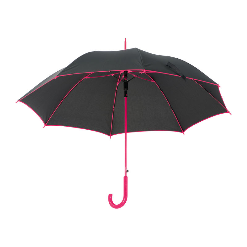 Avtomatski dežnik, izdelan iz 190T pongee tkanine z rebri iz steklenih vlaken, plastičnim ročajem ter barvnim robom, ročajem in okvirjem.