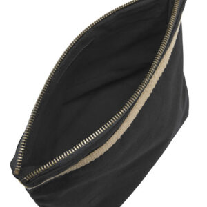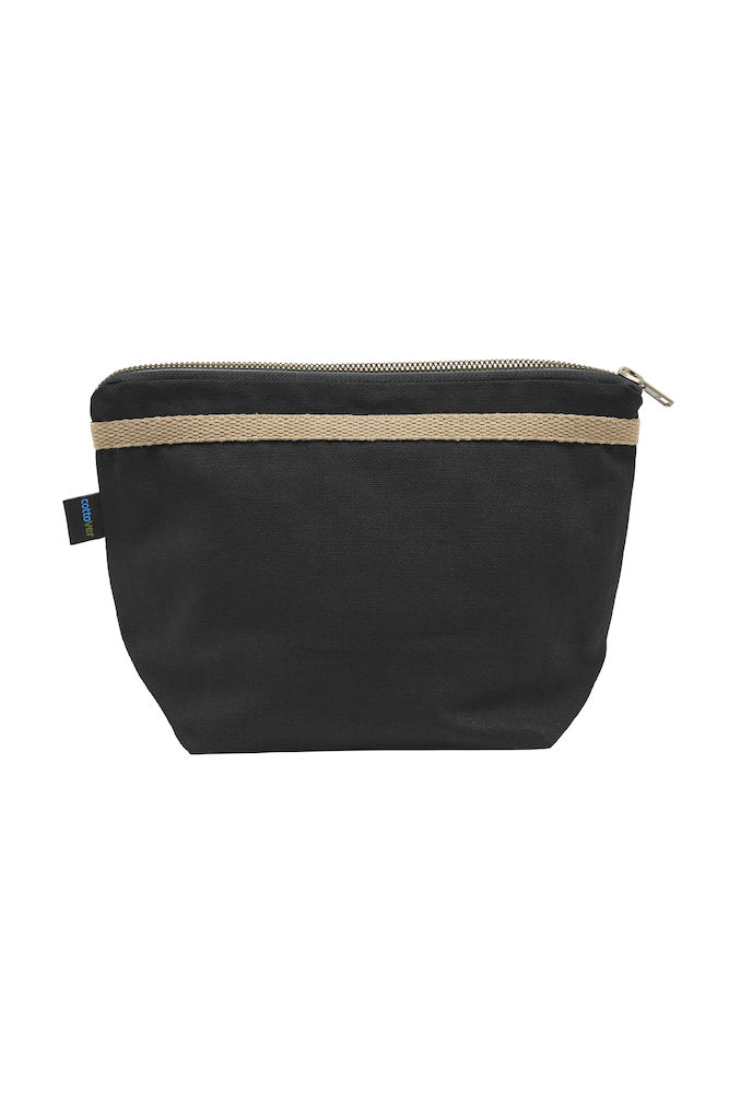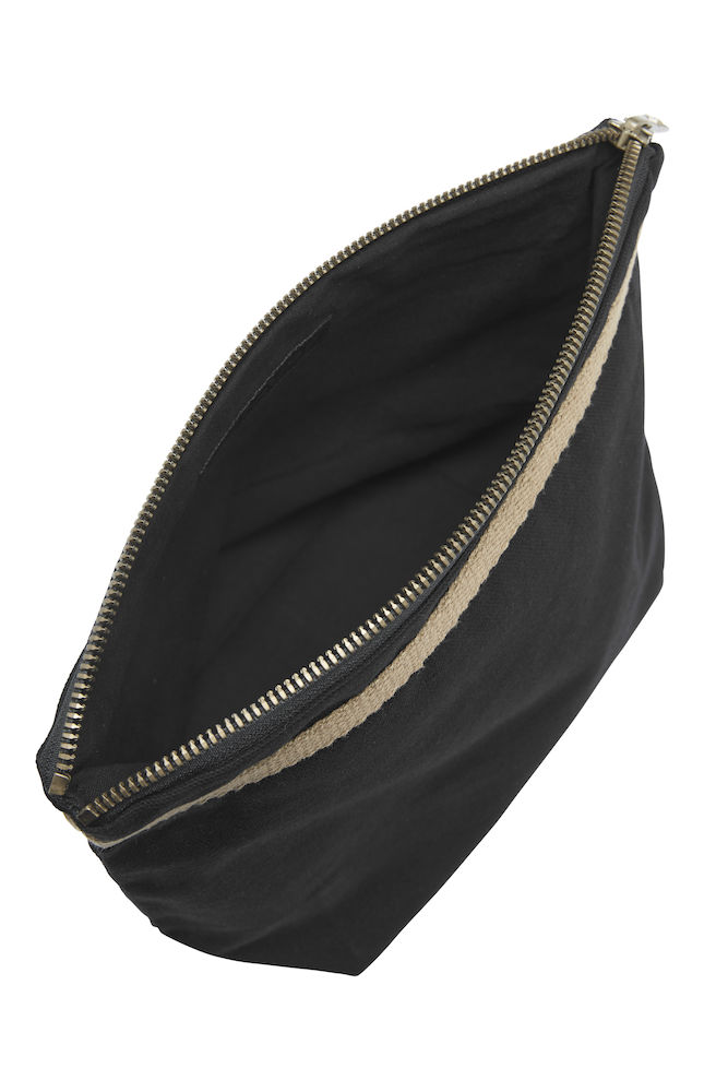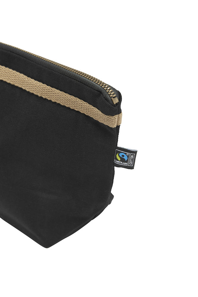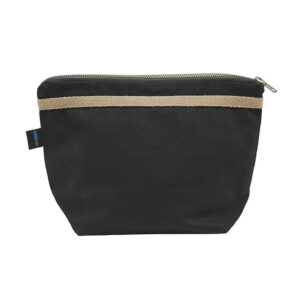 Majhna toaletna torba z enim večjim žepom in dvema notranjima žepoma. Bronasto obarvana YKK zadrga v kovini s starinskim zaključkom. Črna podloga na obeh barvah. Barve: 665 temno oljčna, 990 črna. Material: 100% ekološki bombaž pravične trgovine 320g/m2. Dimenzija: 16x10x17 cm.