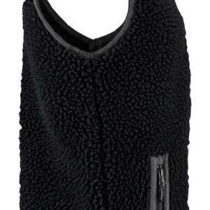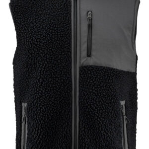 Dvobarvni moški brezrokavnik iz sherpa flisa. Kontrastna tkanina na prsih in obroba ob robovih šivov. Prsni žep in stranska žepa z zadrgami.