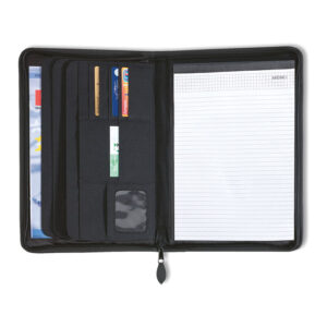 Konferenčna mapa A4, iz 600D poliestra in podloge 210T poliestra, z zadrgo. Vsebuje: Beležnica A4 z 20 črtami. 4 predelki, žepek za kartice.