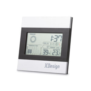 Črna in srebrna vremenska postaja. Vključuje uro, prikaz vlažnosti temperature in koledar. 2 bateriji AAA nista priloženi.
