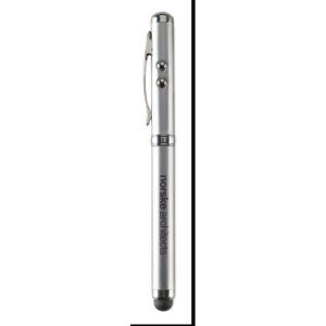 Kovinski Laserski kazalec. Bela LED lučka, rdeč laserski kazalec in mehka konica na dotik. Vključuje 3 gumbaste baterije. Dostavljeno v kovinski pločevinasti škatli.